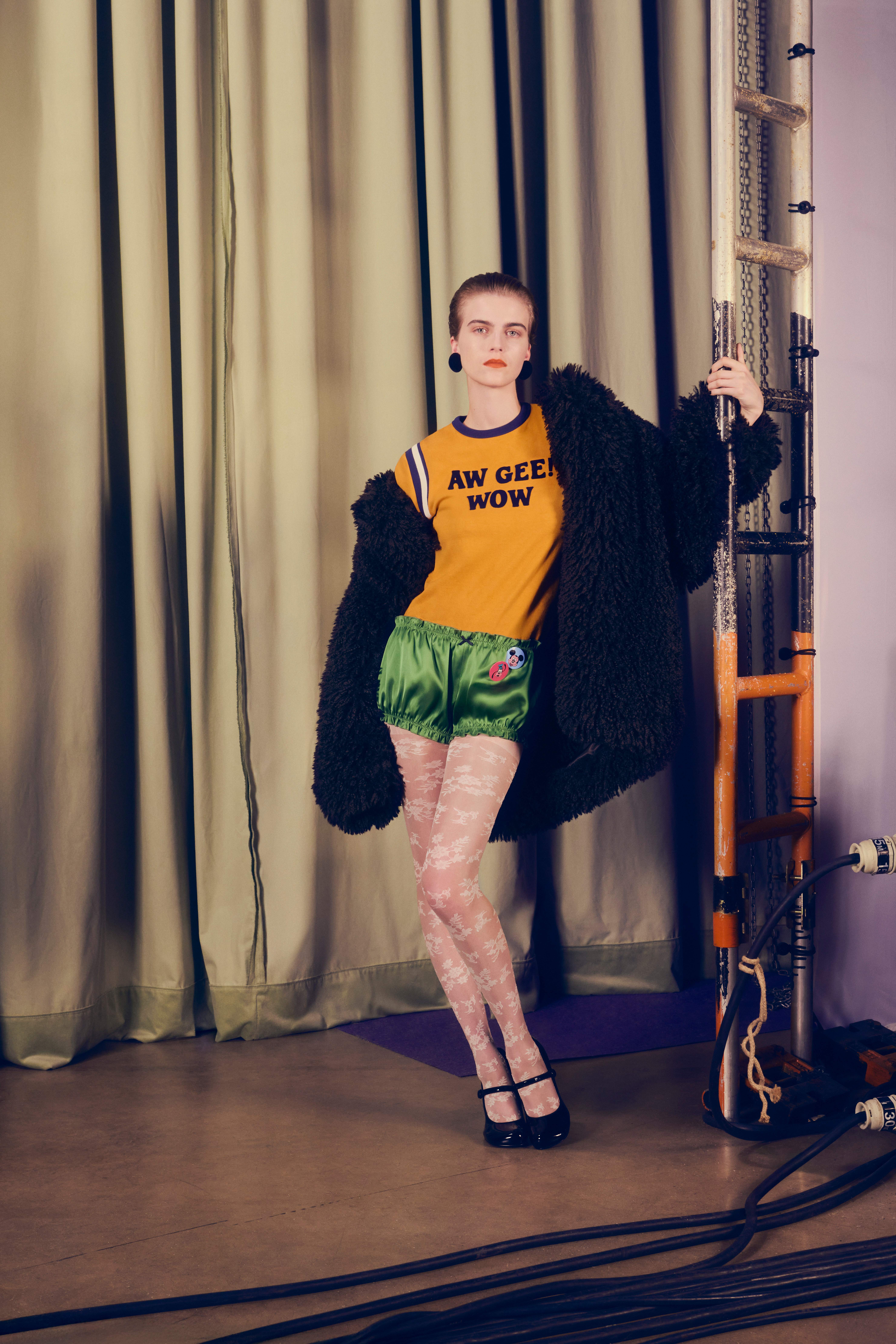AW GEE! WOW系列从迪士尼的色彩调色板中汲取了明快的色调,整体廓形则倾向复古感,灵感直接来自Lambert的新朋友们标志性的风格,并融入了他个人的设计语言。大胆的纽扣、利落(有时毛茸茸的)的衣领、夸张的剪裁被巧妙运用于礼服与日常针织衫之中,搭配趣味十足的色彩和丰富的材质。