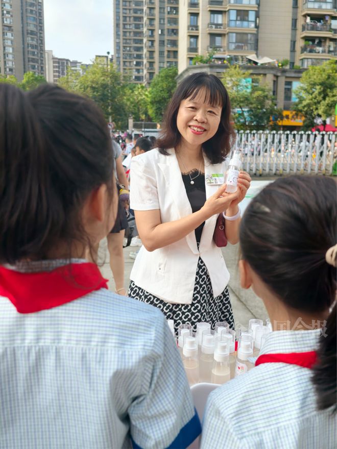 许多老师当场试用了驱蚊喷雾,纷纷称赞孩子们的用心和创意。“味道很清新,效果也很好!”一位年轻老师表示,“能感受到孩子们在制作过程中的认真和爱。”
